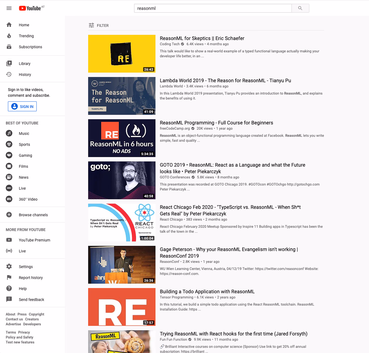 The same goes for other JS focused talks, such as GOTO2019 - ReasonML: React as a Language and what the Future looks like by Peter Piekarczyk (5.8k views) or high volume JS related Youtube channels like Fun Fun Function building a speed typing game with ReasonML and Comic Sans as editor font (19.8k views). There's still a ton more resources about ReasonML we didn't mention, since we were just talking about the first few Youtube hits there.